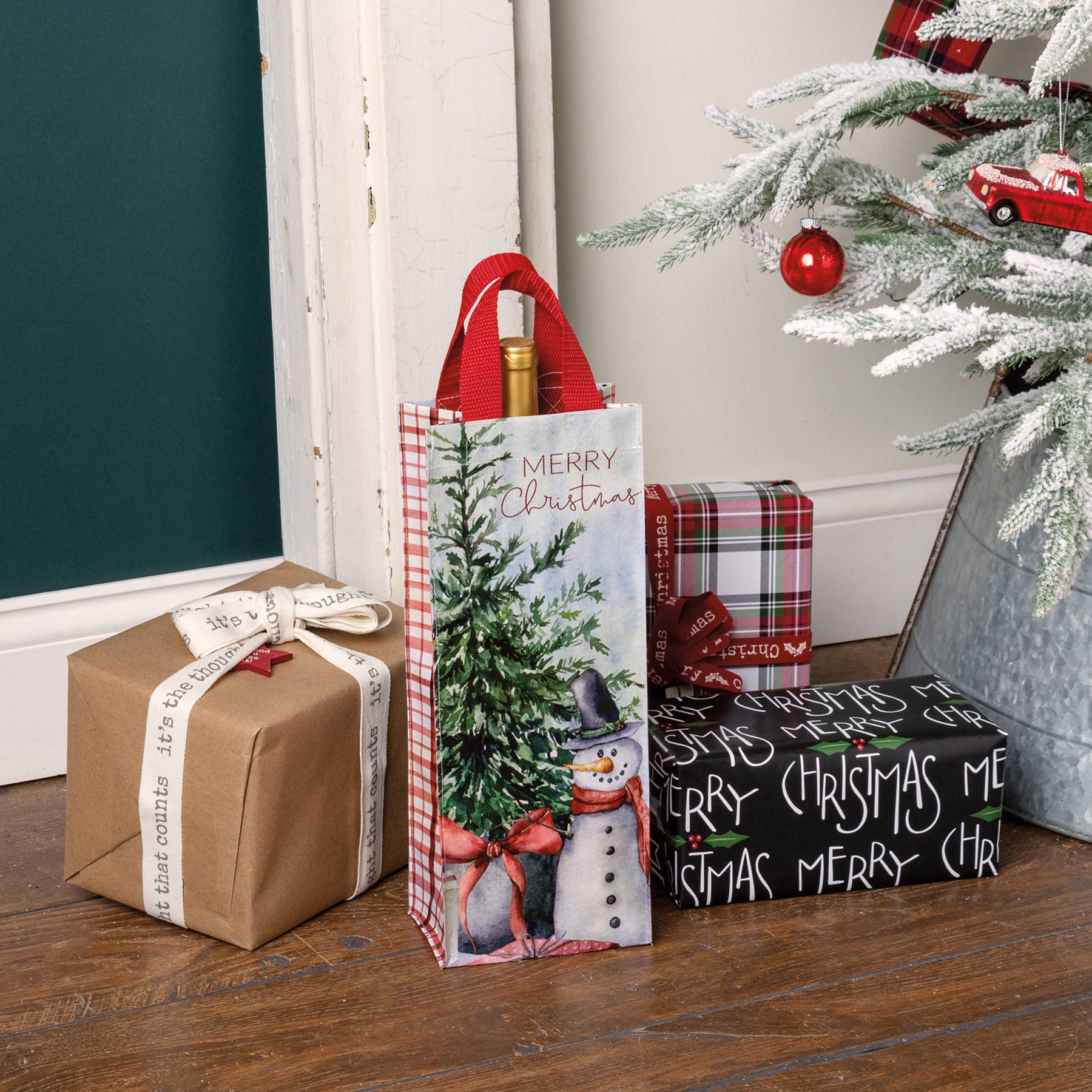 Made of post-consumer material, this double-sided wine tote features "Merry Christmas" sentiment with watercolor tree and snowman designs. Our Merry Christmas wine tote features dual nylon straps for easy carrying.