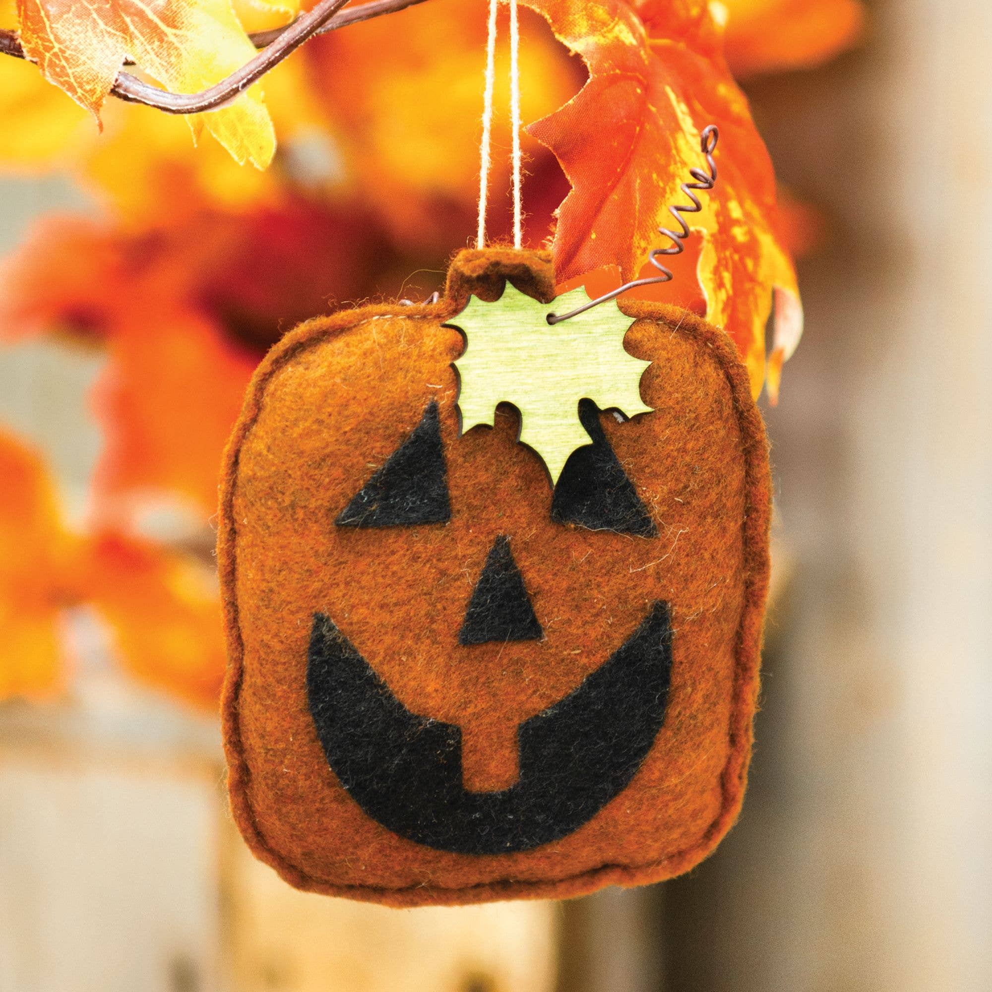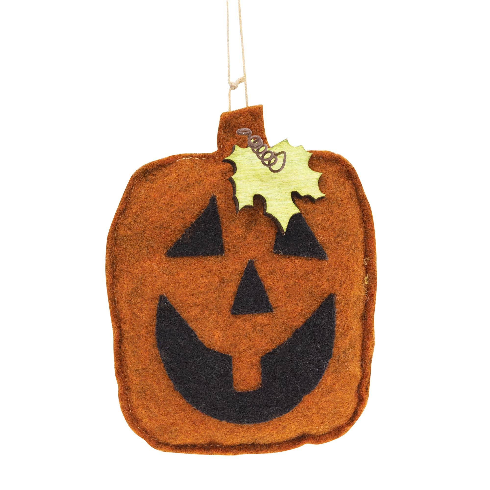 Jack O Lantern Felt Ornament is an orange fabric ornament with a pumpkin design and black felt facial features. Ornament hangs by a string attached at the top and it looks great on the branch of an autumn floral. Measures 4.75" high by 3.75" wide by 1" deep.